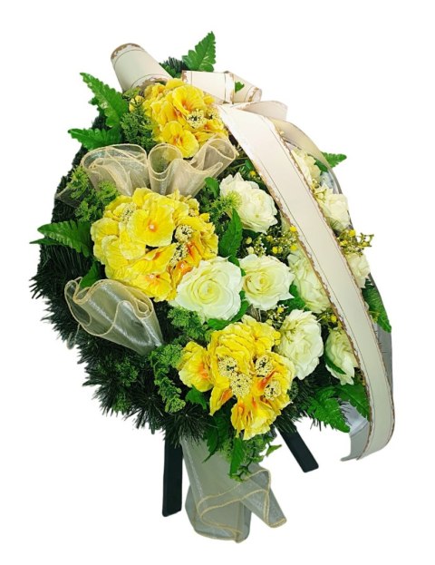 Dzięki odporności na wszelkie warunki atmosferyczne, nasz wieniec pogrzebowy pozostanie nienaruszony i piękny, niezależnie od pogody.
