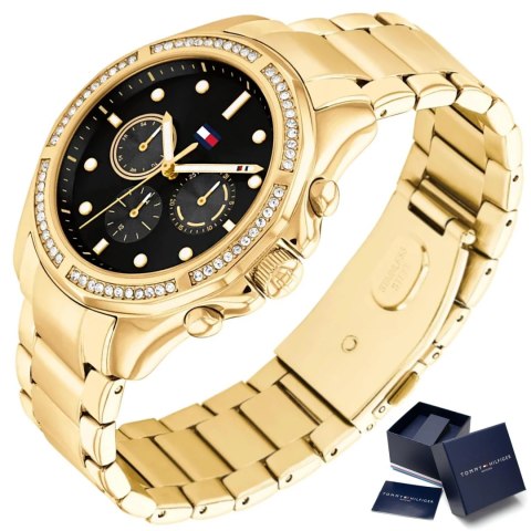 Zegarek Tommy Hilfiger Brooklyn 1782570 to wyjątkowa propozycja od kultowej już marki, będąca odzwierciedleniem najgorętszych trendów. Ten elegancki damski czasomierz zasilany niezawodnym kwarcowym mechanizmem. Koperta oraz bransoleta zostały wykonana ze stali szlachetnej, co gwarantuje jej wieloletnią odporność na zniszczenie. Całość jest utrzymana w kolorze złotym, dodatkowym atutem jest czarna tarcza ozdobiona szlifem słonecznym, który nadaje nowoczesnego industrialnego charakteru. Ponadto model ten jest nie tylko ładny ale i funkcjonalny, posiada trzy subtarcze: dni tygodnia, dni miesiąca oraz czas 24H. Wodoszczelność rzędu 5 ATM, gwarantuje ochronę nawet podczas kąpieli..