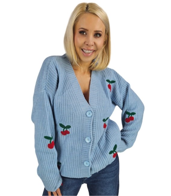 Ciepły i przytulny sweter damski w wisienki wiśnie jesień LARAMIE (Niebieski)