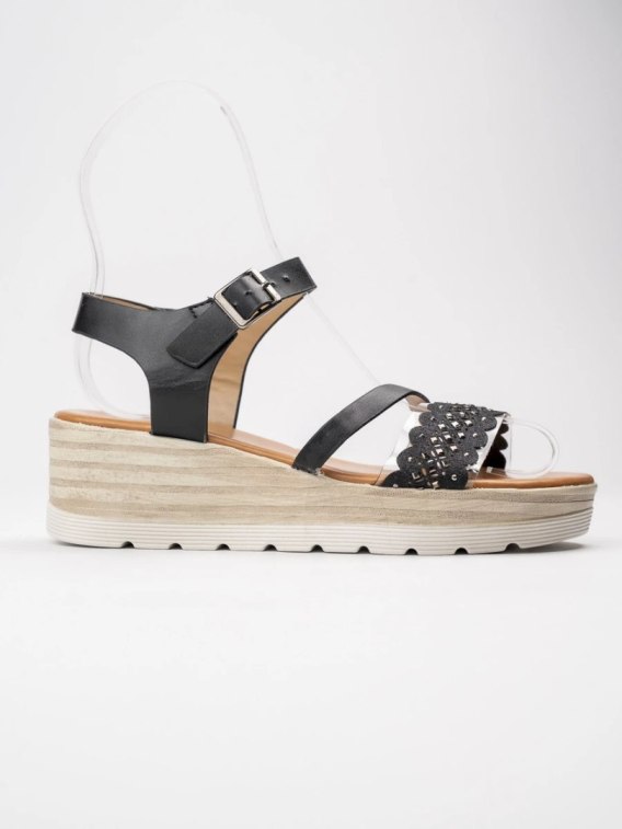 Damskie Sandały SOFIA BLACK to stylowa propozycja na lato, która łączy wygodę z nowoczesnym wyglądem. Cholewka z czarnych pasków, z czego jeden wyróżnia się ażurowym wzorem i subtelnym połyskiem, przyciąga uwagę i dodaje kobiecego akcentu. Stabilna platforma o warstwowym wyglądzie zapewnia komfort noszenia, a regulowany pasek na kostce gwarantuje idealne dopasowanie. Świetnie sprawdzą się do sukienek, spódnic i casualowych stylizacji.