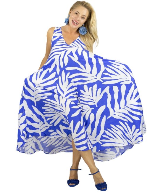 Długa luźna sukienka z printem i kieszeniami BUTTERFLY (Wielokolorowy || Niebieski)