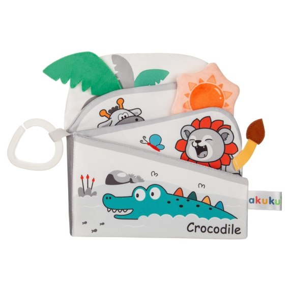 - kolorowe ilustracje - radosne postacie zwierząt (hipopotam, lew, krokodyl, motyl i inne) oraz żywe kolory przyciągają uwagę dziecka i stymulują rozwój wzroku,