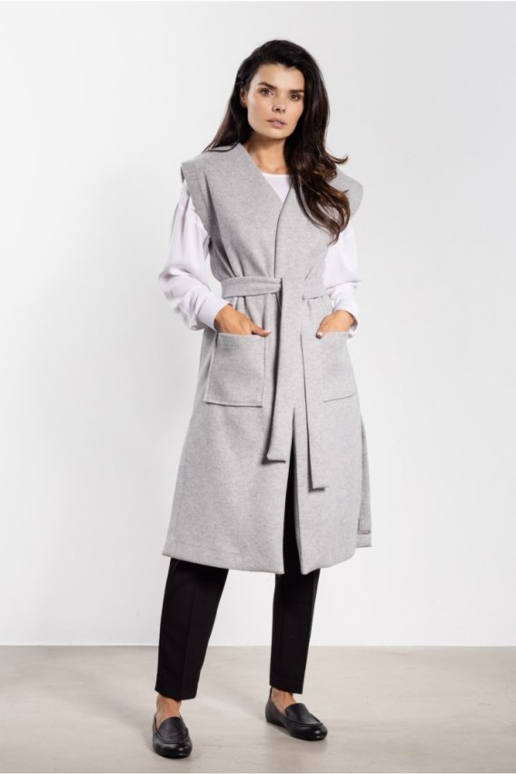 Długa kamizelka damska z miękkiego flauszu to idealny wybór na chłodniejsze dni jesieni. Prosty, minimalistyczny krój sprawia, że świetnie komponuje się zarówno z eleganckimi spodniami, jak i casualowymi jeansami. Dołączony pasek pozwala podkreślić talię, ale kamizelkę można nosić także luźno, tworząc swobodny, nowoczesny look. Duże praktyczne kieszenie i rozcięcia po bokach zwiększają funkcjonalność i dodają modnego charakteru. Polska produkcja i staranne wykończenie gwarantują wysoką jakość.