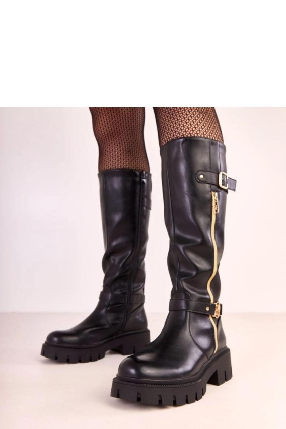 Stylowe kozaki do kolana, które łączą elegancję z funkcjonalnością. Wykonane z wysokiej jakości skóry ekologicznej, prezentują się niezwykle gustownie i są idealnym wyborem na chłodniejsze dni. Model wyróżnia się ozdobnym złotym zamkiem oraz subtelnymi złotymi detalami po zewnętrznej stronie, które nadają całości nowoczesnego, kobiecego charakteru. Dzięki pełnemu zamkowi po wewnętrznej stronie buty są łatwe w zakładaniu, a okrągły nosek zapewnia komfort noszenia. Wnętrze zostało delikatnie ocieplone, co gwarantuje ciepło w jesienno-zimowym sezonie. Stabilny obcas o wysokości 5 cm oraz niska platforma zapewnia wygodę i delikatne uniesienie sylwetki, a cholewka o wysokości 34 cm pięknie układa się na nodze. To klasyczne, wysokie kozaki, które doskonale uzupełnią zarówno codzienne, jak i eleganckie stylizacje.