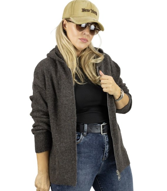 Krótki rozpinany sweter z kapturem kardigan na suwak NORA (Brązowy)