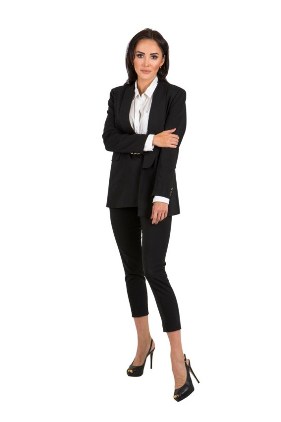 Przedłużana marynarka bez zapięcia. Marynarka z kieszeniami krytymi patkami. Rękawy ozdobione trzema guzikami.