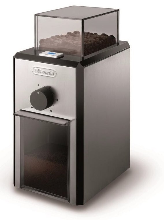 Elektryczny młynek żarnowy o mocy 110 W i pojemności 120 g, z pokrętłem wyboru liczby filiżanek oraz z zabezpieczeniem przed pracą gdy pojemnik na kawę mieloną lub ziarnistą jest niepoprawnie umieszczony.