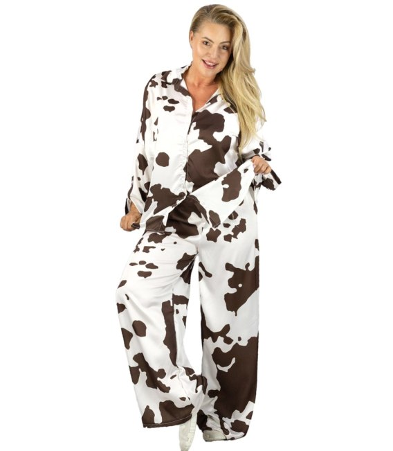 Modny zestaw satynowa koszula i spodnie w krowi print SLOANE (Brązowy)