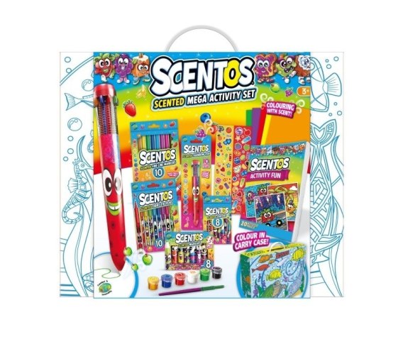 - zestaw zawiera: książeczkę aktywności (20 stron), zapachowe flamastry (10 szt.), zapachowe markery (10 szt), zapachowe kredki świecowe (8 szt.), zapachowe markery ze śmiesznymi minkami (8 szt.), zapachowy długopis żelowy (1 szt. multikolor), 1 arkusik naklejek, zapachowe farbki (6 szt.), pędzelek i 5 kolorowych kartek;