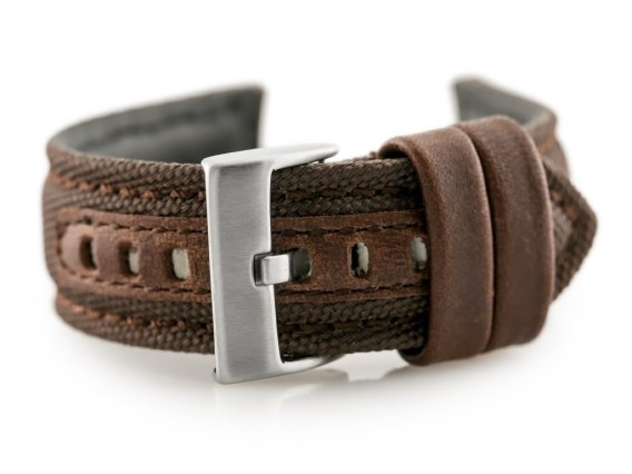 Skórzany pasek do zegarka wysokiej jakości. Zewnętrzna część - parciana - w kolorze brązowym z brązowymi przeszyciami, wewnętrzna cześć - skórzana - w kolorze czarnym.