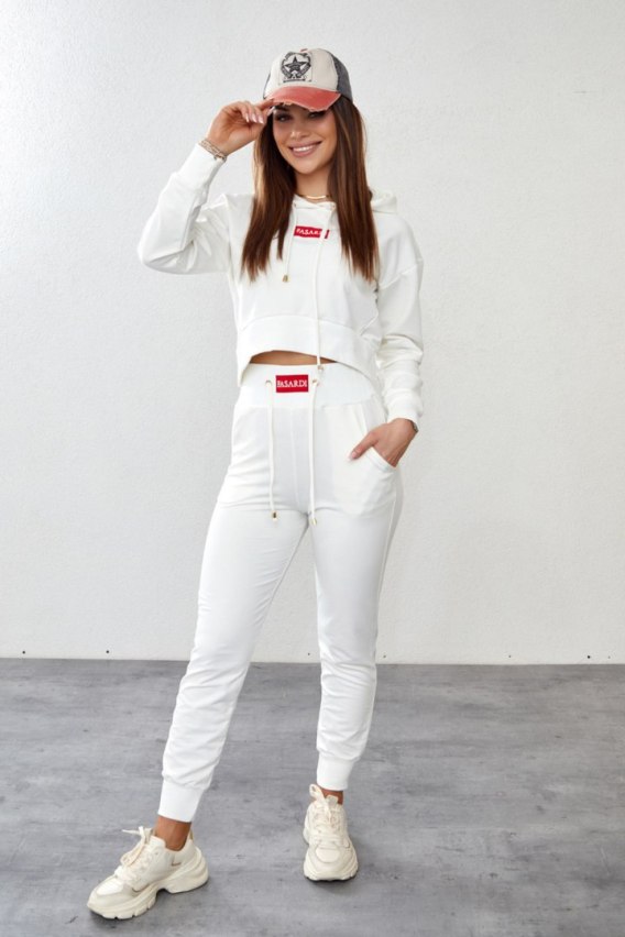 Komplet w młodzieżowym wydaniu z krótką bluzą doskonały do noszenia na co dzień. Asymetryczna krótka bluza, z kapturem oraz długim rękawem. Długie spodnie z podwyższonym stanem oraz zwężanymi nogawkami. W pasie guma oraz wiązanie, po bokach kieszenie wsuwane.