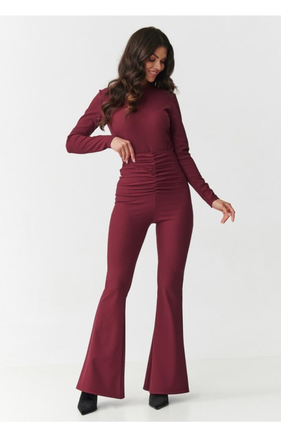 Postaw na look, który łączy w sobie elegancję i wygodę! Ten wyjątkowy komplet damski składa się z dopasowanej bluzki z długim rękawem oraz spodni z wysokim stanem i rozszerzanymi nogawkami. Wykonany z wysokiej jakości prążkowanego materiału pięknie podkreśla sylwetkę i zapewnia komfort noszenia przez cały dzień. Bluzka ma klasyczny krój z zabudowanym dekoltem i zapinana jest z tyłu na zamek, co czyni ją wygodną i jednocześnie bardzo szykowaną. Spodnie z wysokim stanem, podkreślają talię i modelują figurę a dzięki marszczeniu w pasie nadają sylwetce proporcji natomiast rozszerzane nogawki typu flare optycznie wydłużają nogi. Dostępny w czterech ponadczasowych kolorach: bordowy kobiecy i zmysłowy, czarny klasyk pasujący do wszystkiego, czekoladowy nowoczesny i wyrazisty, beżowy elegancki i subtelny. To komplet, który sprawdzi się na wiele okazji od wieczornych spotkań, przez uroczyste wyjścia, aż po biznesowe stylizacje. Wystarczy dodać ulubione buty na obcasie i biżuterię, aby stworzyć efektowny i nowoczesny look.