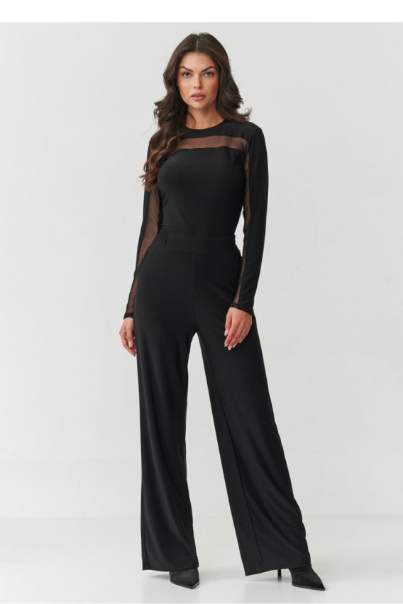 Postaw na elegancję w nowoczesnym wydaniu! Ten czarny komplet damski to połączenie wygody i ponadczasowego stylu. Składa się z dopasowanej bluzki z długim rękawem oraz spodni z szerokimi nogawkami, tworząc spójną, szykowną całość. Bluzka z subtelnymi, transparentnymi wstawkami na dekolcie i rękawach dodaje lekkości oraz zmysłowego charakteru a okrągły dekolt delikatnie podkreśla szyję i ramiona jednocześnie zapewniając wygodę w codziennym noszeniu. Spodnie mają wysoki stan, który pięknie podkreśla talię i wydłuża sylwetkę. Nogawki są szerokie i luźno opadające, co dodaje całości lekkości i sprawia, że spodnie są niezwykle wygodne w noszeniu. Czarny kolor to klasyka, która nigdy nie wychodzi z mody ? optycznie wysmukla sylwetkę i dodaje elegancji. Ten czarny komplet damski to must-have w garderobie każdej kobiety, która lubi wyglądać modnie, a jednocześnie czuć się swobodnie. Zestaw go z ulubionymi szpilkami lub botkami, a stworzysz look, który zachwyci w każdej sytuacji.
