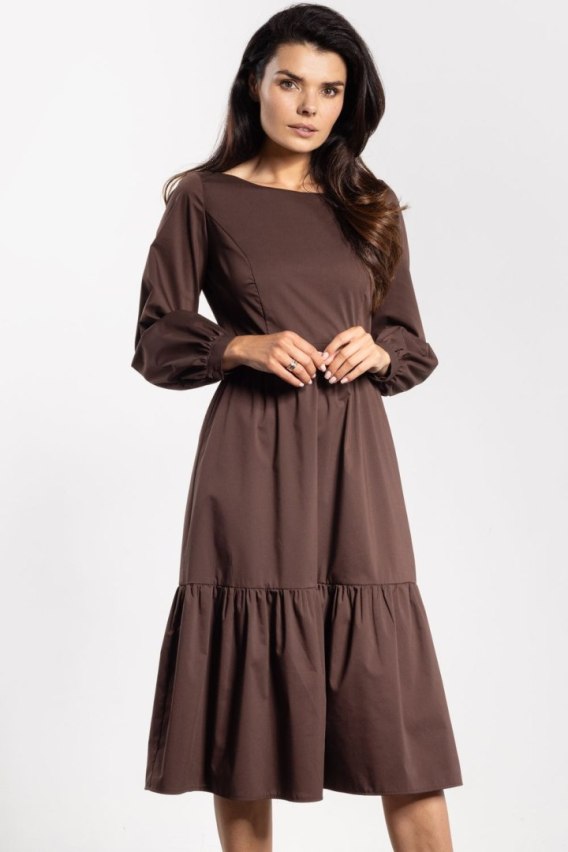 Stylowa sukienka midi o rozkloszowanym fasonie łączy elegancję z kobiecym wdziękiem. Dopasowana góra subtelnie podkreśla sylwetkę, a odcięcie w talii nadaje harmonijnych proporcji. Rozkloszowany dół z szeroką falbaną układa się lekko przy każdym ruchu, wprowadzając romantyczny akcent. Długie rękawy z mankietami i guzikiem dodają elegancji, a długość za kolano sprawia, że sukienka sprawdzi się zarówno na co dzień, jak i na oficjalne okazje.