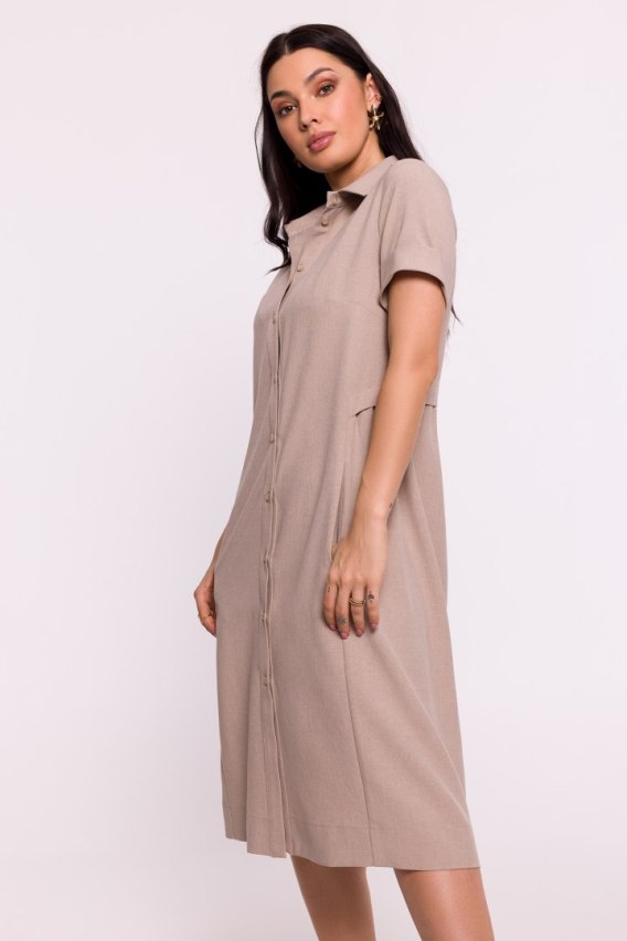 Sukienka koszulowa to połączenie klasyki i funkcjonalności, stworzone z najwyższej jakości tkaniny. Ten elegancki model prezentuje się w formie koszuli z krótkimi rękawami, doskonałej na każdą okazję. Przód sukienki jest zapinany na guziki, co dodaje jej subtelnej elegancji, a pod szyją umieszczony jest stylowy kołnierzyk, podkreślający wyrafinowany charakter kreacji. Kieszenie w szwach na przodzie sukienki nie tylko dodają praktycznego elementu, ale także wprowadzają do designu nutę swobodnego stylu. Bez podszewki, ta sukienka jest lekka i komfortowa, idealna na ciepłe dni. Długość za kolano sprawia, że jest to uniwersalny model, który świetnie sprawdzi się zarówno w codziennych sytuacjach, jak i na bardziej formalnych okazjach. Projekt oraz produkcja sukienki odbywają się w Polsce, co podkreśla zaangażowanie w rozwój krajowej mody. To nie tylko wyraz lokalnego charakteru, ale także gwarancja wysokiej jakości wykonania. Ta sukienka koszulowa to połączenie tradycji, nowoczesności i wygody, idealne odzwierciedlenie polskiego podejścia do mody.