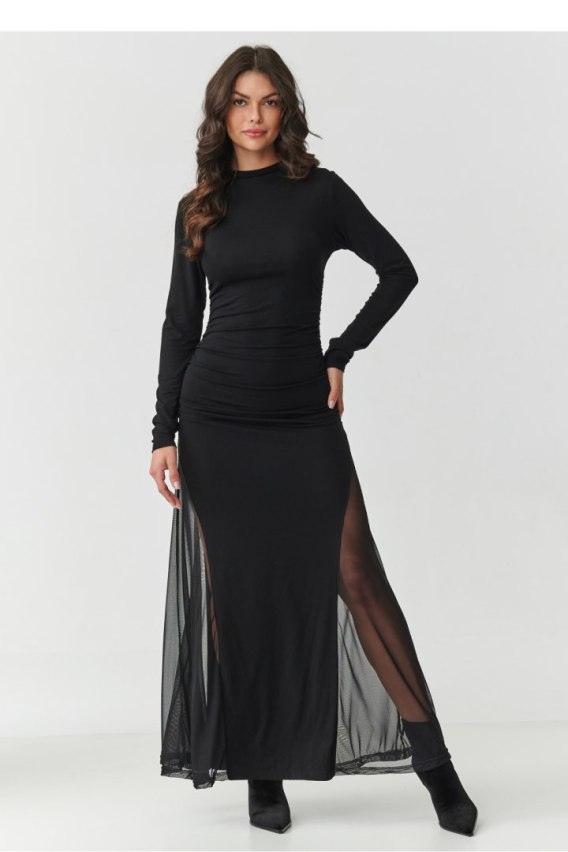 Odkryj niezwykle kobiecą i elegancką sukienkę maxi, stworzoną z myślą o kobietach, które cenią klasykę z nutą zmysłowości. Dopasowany krój pięknie podkreśla sylwetkę, eksponując kobiece kształty w subtelny, ale wyrazisty sposób. Głębokie i transparentne wstawki z tiulu po bokach dodają całej stylizacji lekkości i seksapilu oraz wyjątkowego charakteru. Zabudowany, klasyczny dekolt to ukłon w stronę ponadczasowej elegancji, równoważy odważniejsze elementy sukienki i doskonale podkreśla linię szyi oraz ramion. To właśnie ten kontrast sprawia, że całość prezentuje się stylowo, z klasą i odrobiną tajemniczości. Z tyłu sukienki znajduje się dyskretny, kryty zamek, który zapewnia wygodne zakładanie i perfekcyjne dopasowanie do sylwetki. To praktyczne rozwiązanie, które nie odciąga uwagi od efektownego kroju, a jednocześnie zapewnia komfort noszenia. Sukienka dostępna jest wyłącznie w klasycznym, ponadczasowym kolorze czarnym, który podkreśla jej elegancję i uniwersalny charakter. To odcień, który nigdy nie wychodzi z mody, wysmukla sylwetkę i sprawia, że stylizacja zawsze prezentuje się z klasą. To idealna propozycja na wyjątkowe okazje, kiedy chcesz poczuć się pięknie, pewnie i wyjątkowo. To nie tylko sukienka, to sposób na wyrażenie siebie.