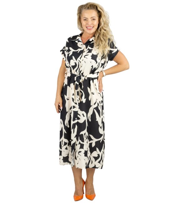 Sukienka koszulowa midi w abstrakcyjny wzór z paskiem NINA (Wielokolorowy || Czarny)