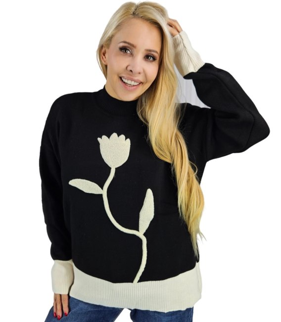 Sweter damski półgolf ciepły nadruk kwiatka jesień zima ROSELYN (Czarny)