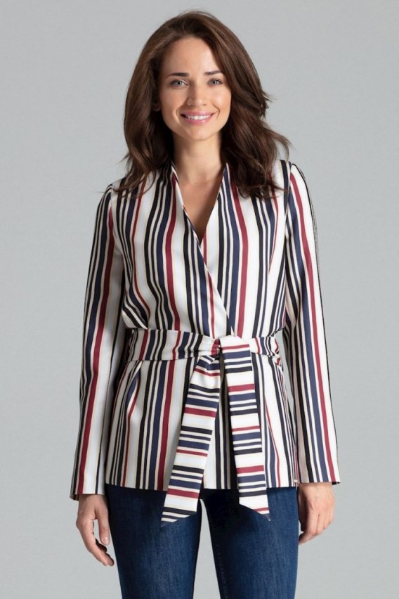 Prosty żakiet w paski bez zapięcia z asymetrycznym przodem, wiązany szarfą pasie. Bez kieszeni z podszewką w kolorze żakietu.