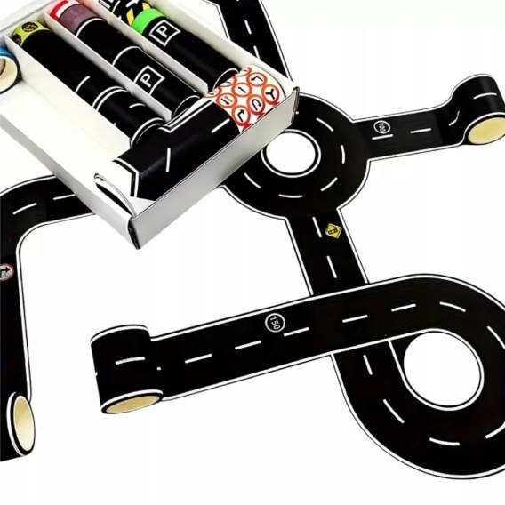 Dzieci mogą projektować własne autostrady, tory, skrzyżowania i parkingi, a dzięki samoprzylepnej papierowej taśmie — łatwo je naklejać, odklejać i modyfikować.